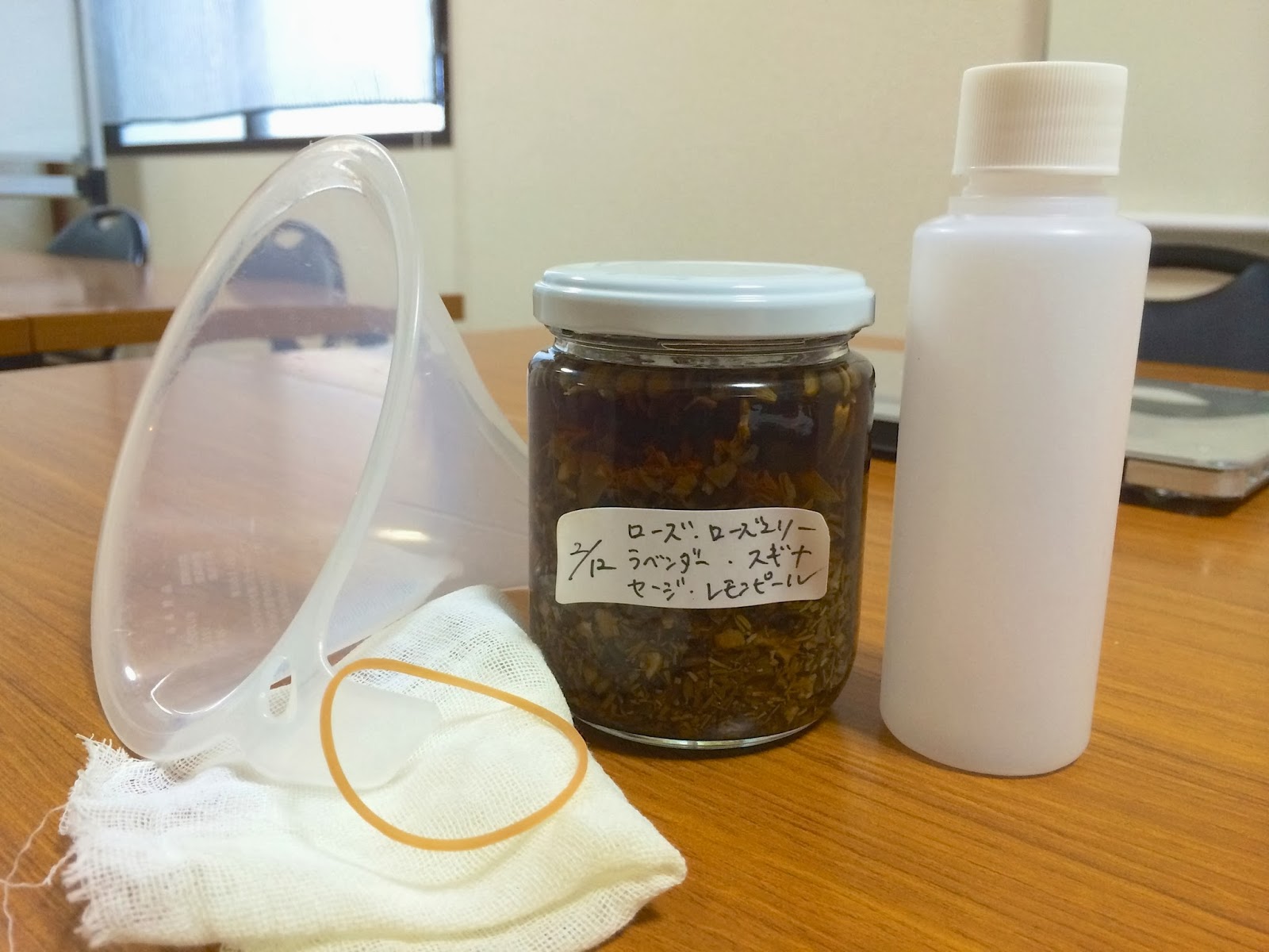 保存容器とガーゼ、輪ゴム、じょうごです
